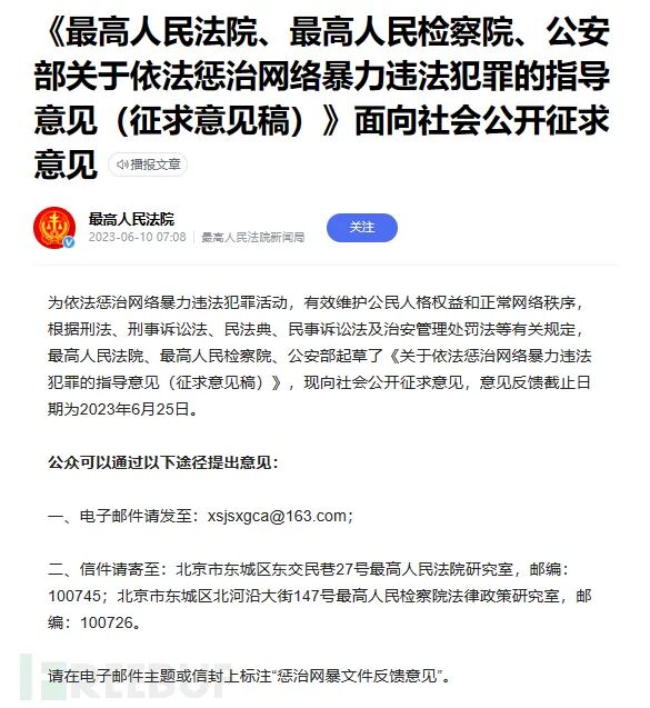 随着多起网暴事件的发酵,官方也终于是看不下去了。就在今年6月9日,最高人民法院、最高人民检察院、公安部发布《关于依法惩治网络暴力违法犯罪的指导意见(征求意见稿)》(以下简称《征求意见稿》),面向社会公开征求意见。