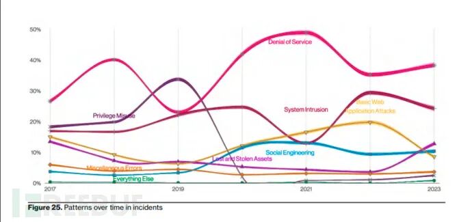 DBIR在2014年首次引入了事件模式分类,而在每年的报告中会根据攻击类型和威胁态势的变化发生一些合并与改变。今年共分为基本Web应用程序攻击、拒绝服务、资产丢失、混合错误、特权滥用、社会工程学、系统入侵以及其他错误,共计八种分类模式。