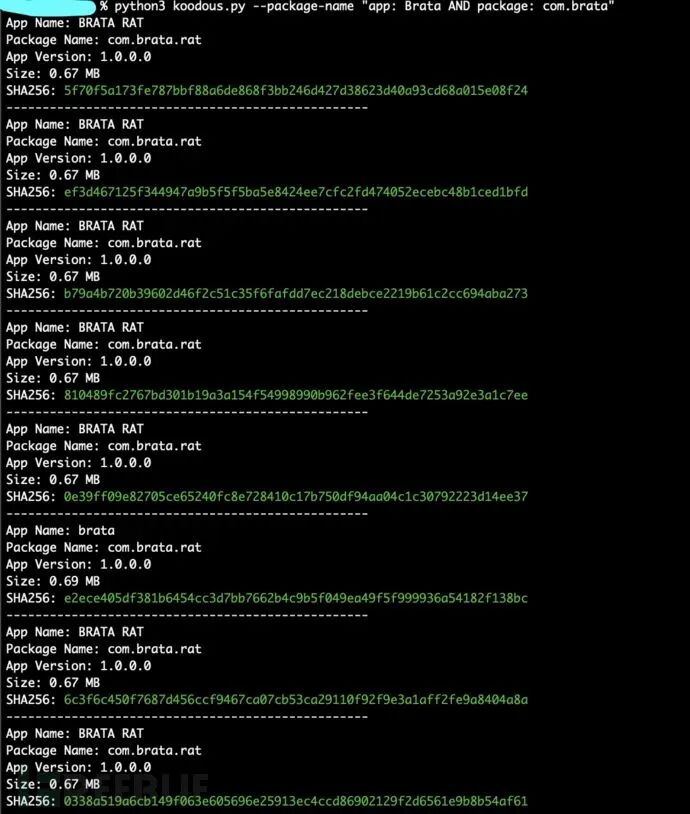 koodous.py --package-name "app: Brata AND package: com.brata"(向右滑动,查看更多)