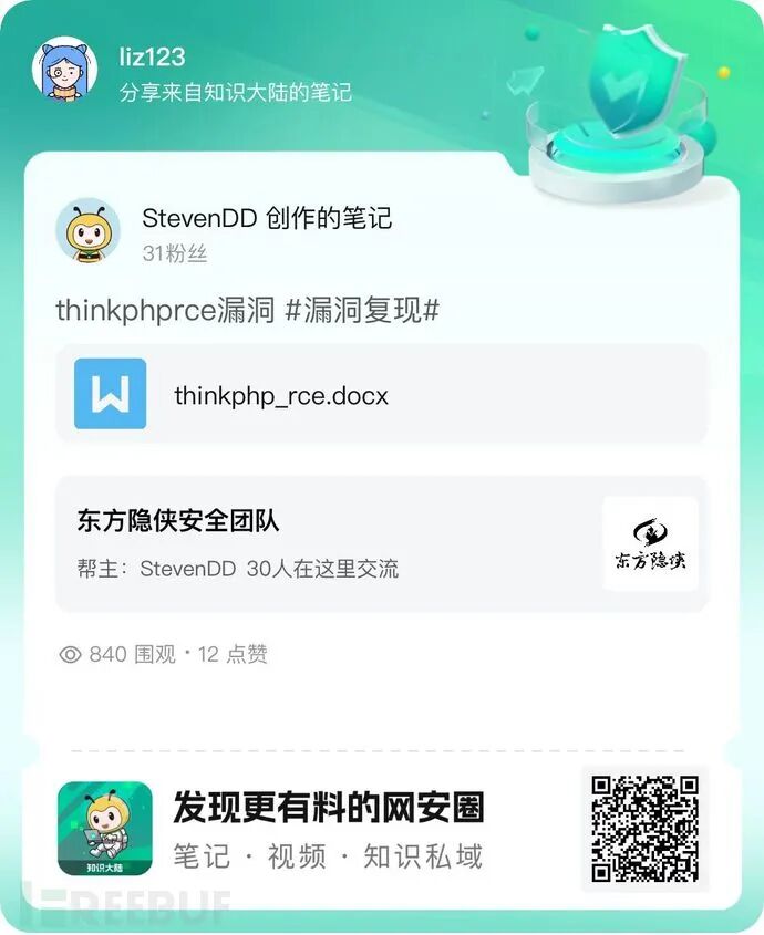 此笔记详细阐述了thinkphprce的漏洞原理,并进行了一次漏洞复现,并针对此漏洞给出了比较有针对性的修复意见。