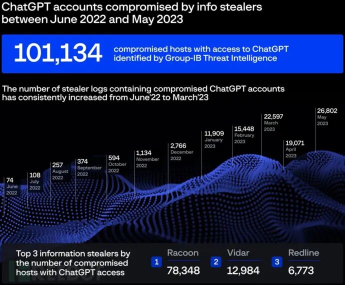 Bleeping Computer 网站披露,国际网络安全公司 Group-IB 报告显示,暗网交易平台上正在出售超过 10 万名 ChatGPT 用户的个人信息。