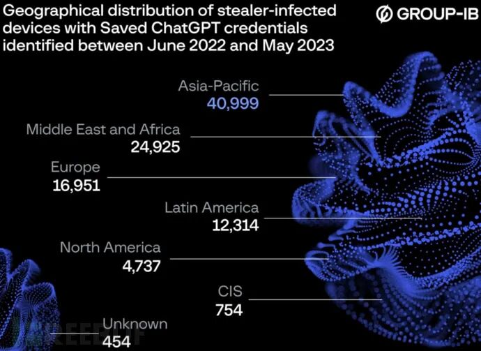 从 Group-IB 统计的数据来看,2022 年 6 月至 2023 年 5 月期间,暗网平台有许多 ChatGPT 账户正在”待售“,买卖高峰期出现在 2023 年 5 月,当时威胁者发布了 26800 个新 ChatGPT 用户信息。值得一提的是,Group-IB 表示按照 ChatGPT 帐户所属地区划分,亚太地区为 40999 条、中东和非洲地区 24925 条、欧洲 16951 条。