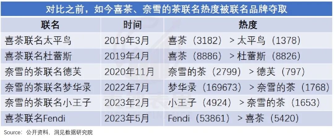 作为交叉验证,也可以看到,此前各种联名活动中,喜茶、奈雪的热度与联名品牌旗鼓相当,甚至略胜一筹。但近两年它们的热度,被联名品牌远远甩在了后面。