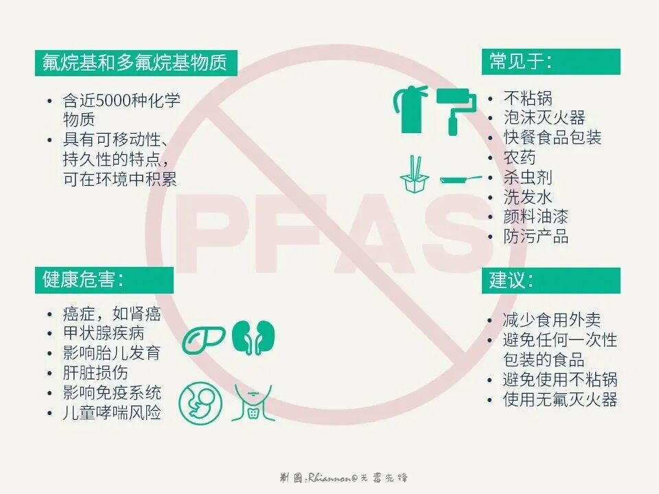 大众对于塑料等白色污染已经耳熟能详,但是某些特定化学品的危害,还未能引发足够重视。事实上,这类物质的影响范围已远超想象,PFAS就是其中之一。PFAS 是一种庞大的化学物质群体,常见的有5000多种化学品。因具有防水、防油脂、减少摩擦力和高热稳定性等特征,常被用于各种工业制造当中,如今在日常生活中也无处不在。如果要追根溯源,PFAS源于二战时期美国的“曼哈顿计划”, 一位化学家将黄绿色的有毒气体氟气通过了一个碳弧,创造出几乎无法被破坏的碳-氟键(C-F键),PFAS因此诞生。随后不久,跨国公司3M公司买下这名化学家的技术专利,并从从国防领域迅速拓展应用到石油化工、电器、建筑等民生领域。自上世纪四五十年代以来,PFAS已广泛用于多种消费者产品,包括灭火剂、不粘锅、清洁喷雾、防水运动用品、防污地毯、化妆品等,甚至还出现在日常快餐包装中。如同硬币的一体两面,PFAS独特的化学性质一方面带来无限的商业价值,另一方面则使其迈入“毒海深渊”。由于PFAS拥有极难被破坏的碳-氟单键(C-F键),使其难以光解、水解、被生物降解或被动物体代谢。当PFAS被人体吸收后,首先在体内与血清蛋白结合,然后沉积在肝脏、肾脏和睾丸等身体各个脏器中无法排出,甚至增加甲状腺疾病、高胆固醇和高血压、糖尿病和慢性肝病,以及某些类型的癌症,如肾癌和睾丸癌的风险。无毒先锋行动发起人毛达向36碳表示,PFAS的环境半衰期可达百年,这种几乎不降解的特性决定了它带来的危害将至少延续好几代人。他谈到,作为一种典型的内分泌干扰物,PFAS超出了传统观念“剂量决定毒性”的认知范围,不仅极微量的暴露就可能带来健康风险,而且还要考虑人体接触的敏感时期,导致所谓的安全水平更加难以预测。因此PFAS的存在本身就有很显著的不可控风险。PFAS进入人体的途径。图源:无毒先锋