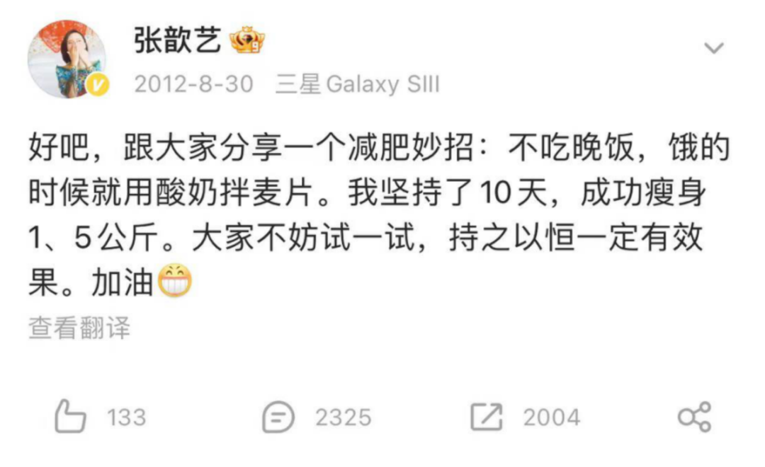 演员张歆艺的远古减肥贴,也被扒出来作为酸奶减肥法的有力证明。