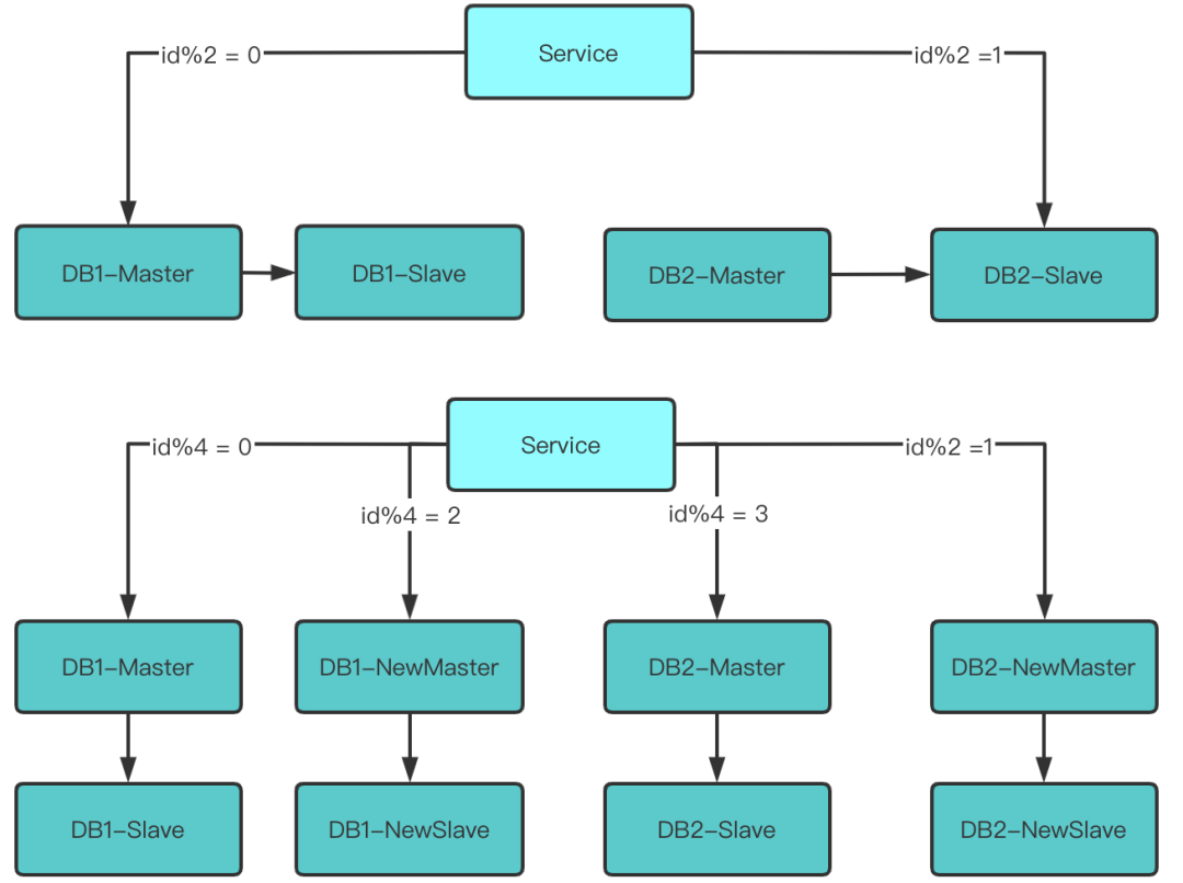 Id % 2 = 0 的库变为了 id % 4 = 0 或 id % 4 = 2